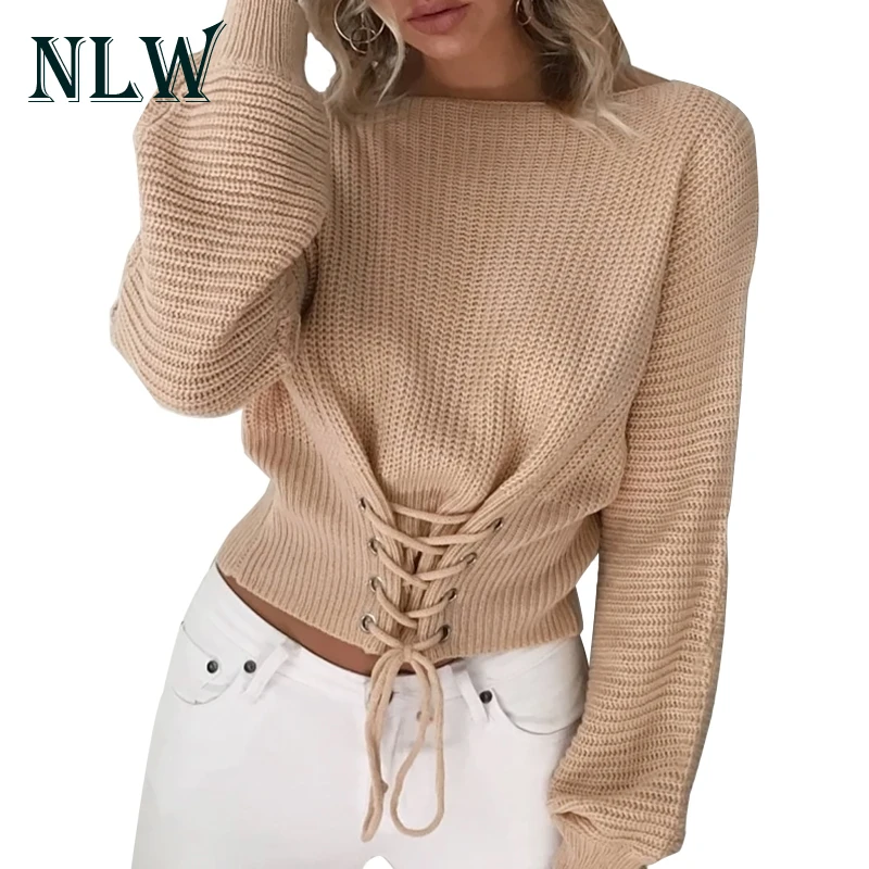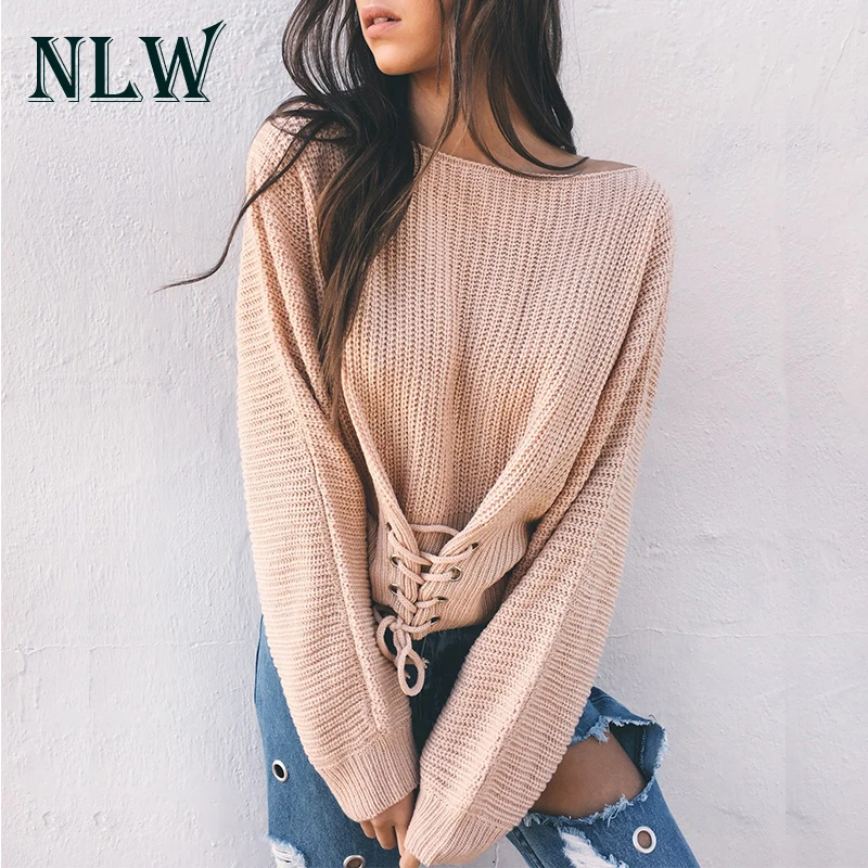 . [Скидка 49%] Купить NLW Повседневный женский свитер со шнуровкой, Осень зима 2019, вязанные пуловеры с длинным рукавом и круглым вырезом, свободный джемпер, топ, ба... Цена Дешево.