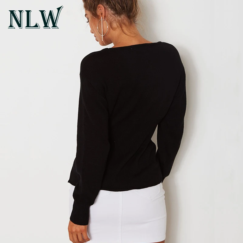 Special Offer NLW Повседневный женский свитер со шнуровкой, Осень зима 2019, вязанные пуловеры с длинным рукавом и круглым вырезом, свободный джемпер, топ, ба... Discount 49% Today!