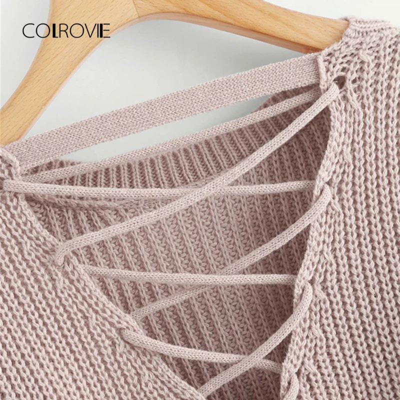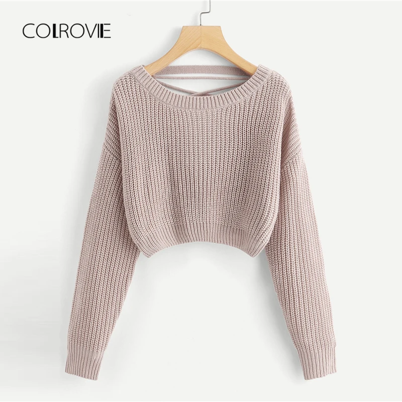 Special Offer COLROVIE розовый Корейский крест накрест V Сзади зимний укороченный вязаный свитер женская одежда 2018 осенний пуловер Джемпер женские свитера Discount 40% Today!