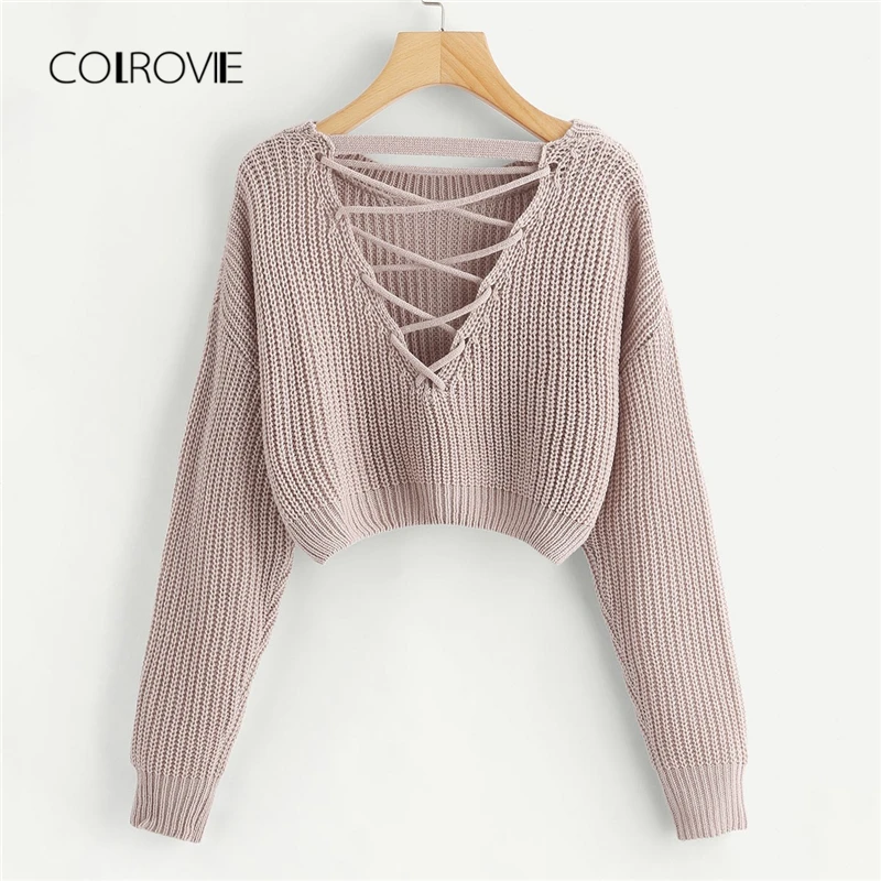 . [Скидка 40%] Купить COLROVIE розовый Корейский крест накрест V Сзади зимний укороченный вязаный свитер женская одежда 2018 осенний пуловер Джемпер женские свитера Цена Дешево.